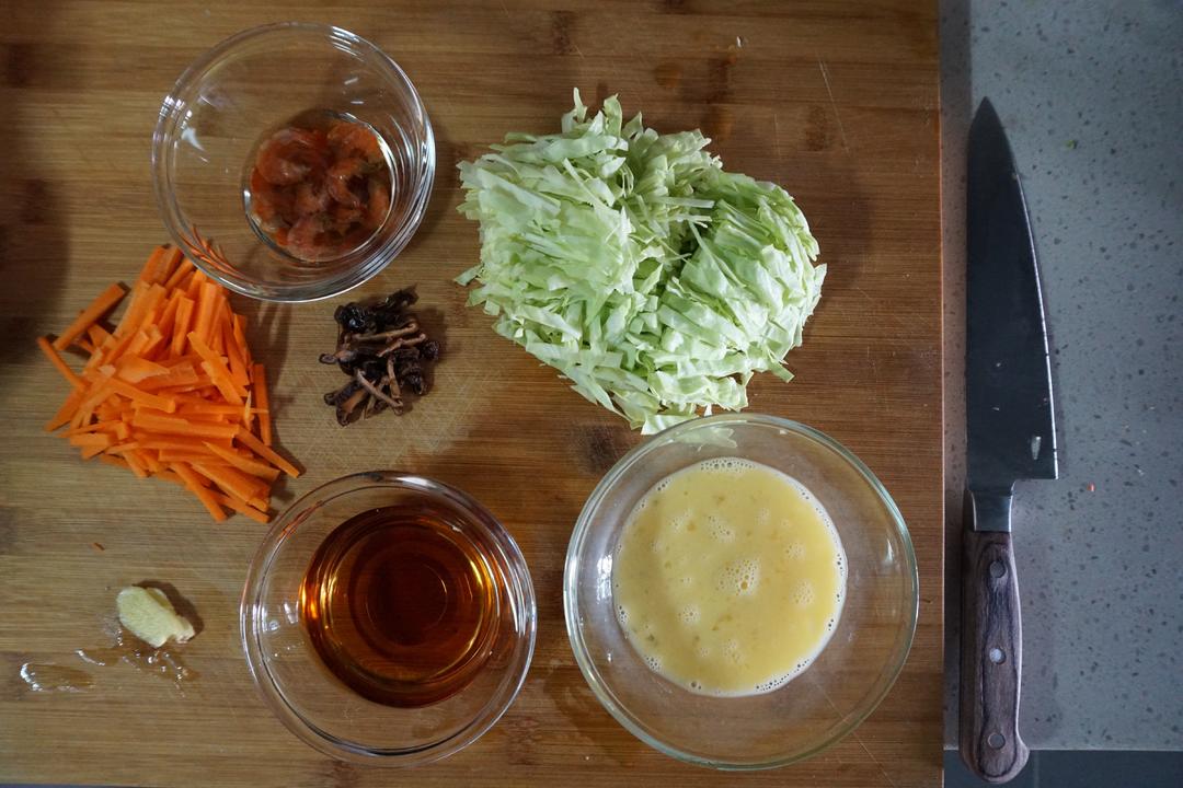 3:香菇、胡萝卜、包菜切细条; 少量生姜切片; 鸡蛋打散; 洗净后的虾干泡于料酒中;