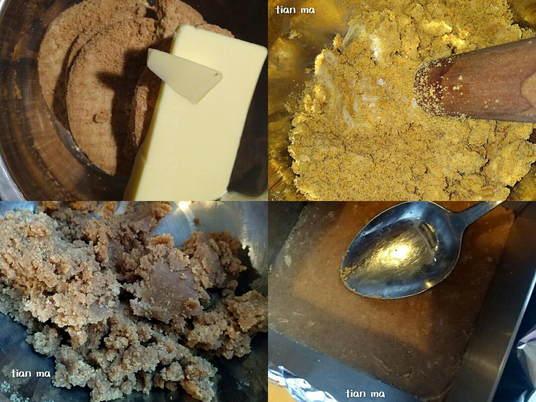 消化饼干75克,软化黄油30克,用擀面杖端头边捣边混匀,混合到质地均匀成块,慕斯方模底部包铝箔纸,把黄油饼干碎用勺子压实,入冰箱冷藏。
