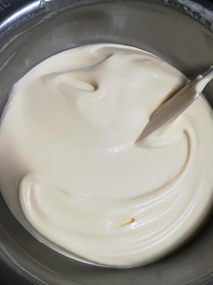 搅拌好的蛋黄糊是这个状态的。细腻光滑有光泽。蛋黄糊先放置一边,开始打蛋白