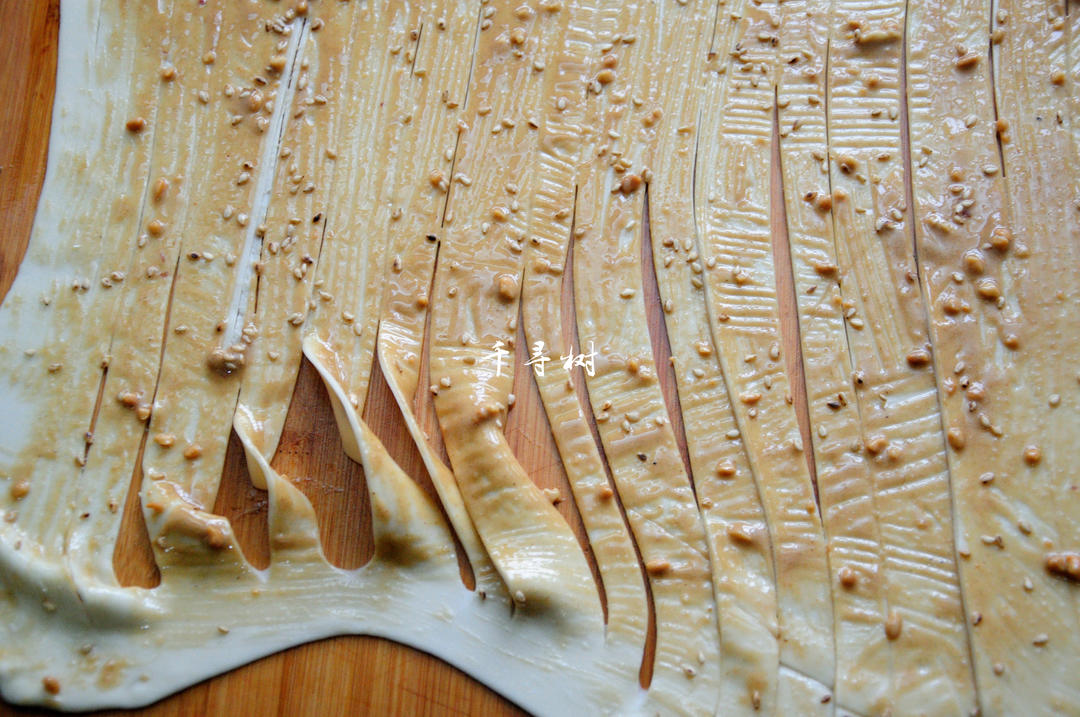 重点来了:用锋利的小刀把擀开的面片划上N刀,如果喜欢层次多就多划几刀。注意面片的两头不要划断,方便后续操作。