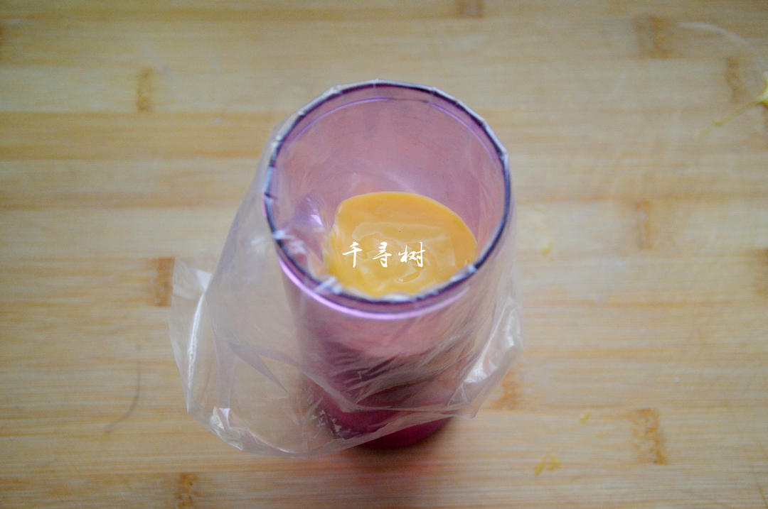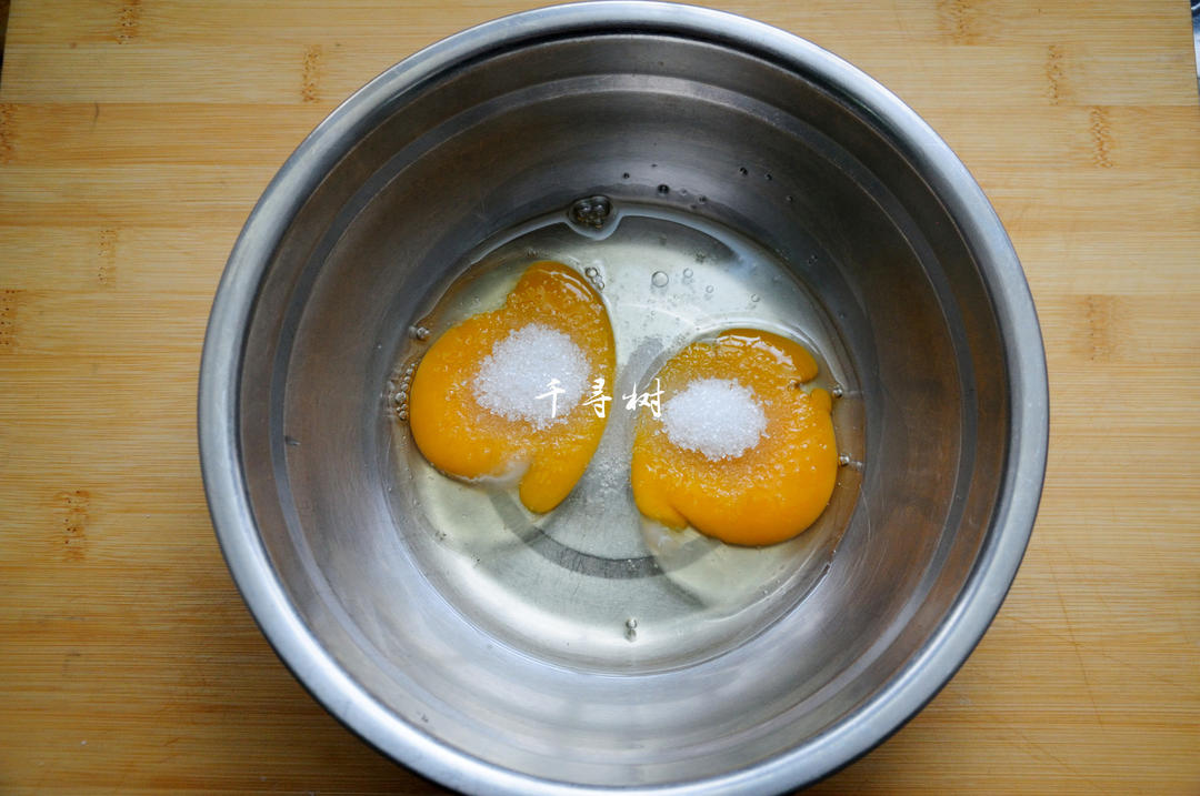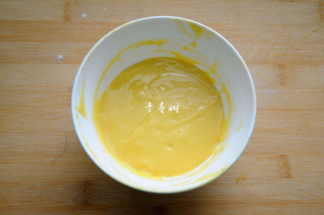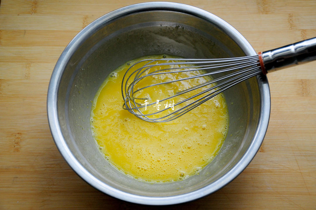 鸡蛋液搅打到散开就行了,不用搅打到打发状态,搅拌的目的是为了将白砂糖完全融化,而不是为了打发。