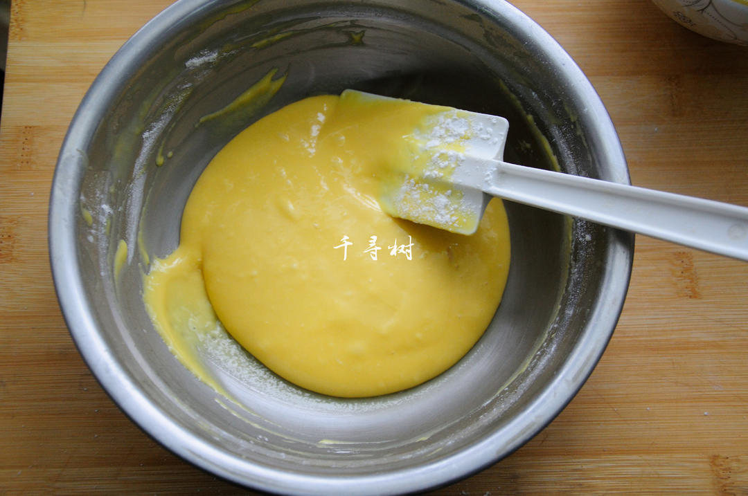 面盆太小,蛋抽施展不开,改用了刮刀,采用翻拌或是切拌的方式,搅拌成细腻光滑的面糊。