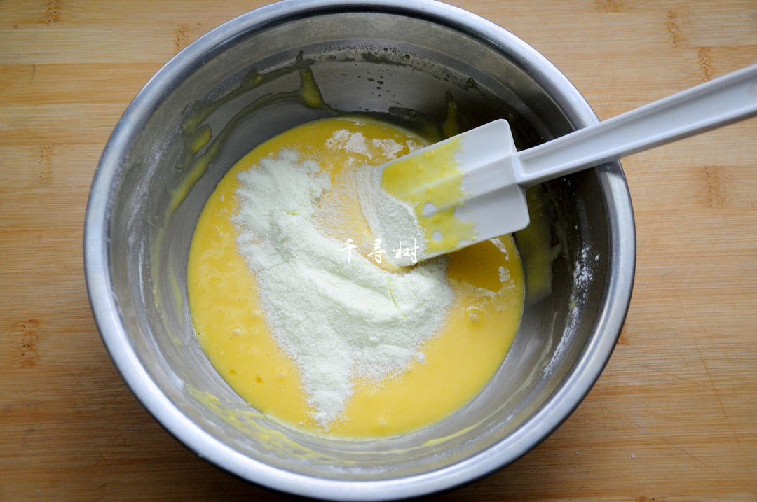将低筋粉筛入或直接倒入搅匀的蛋液中,用蛋抽呈Z字形或无规则方向搅动。