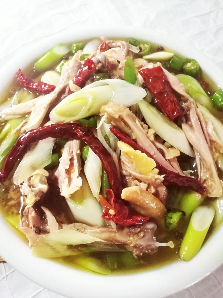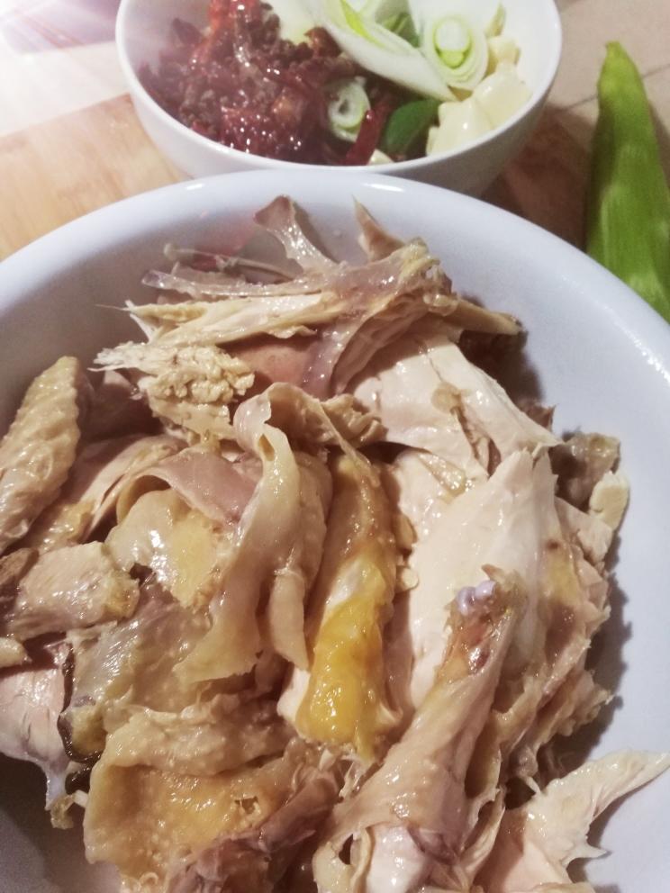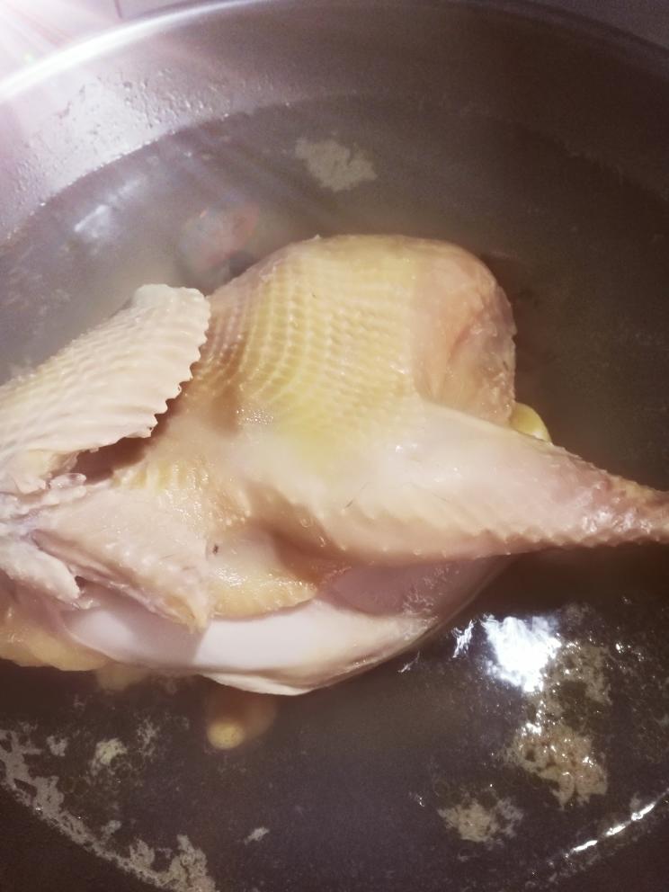 把鸡再一次放入锅里放冷水 ,花椒粒, 香葱结,生姜片 开火,把鸡煮熟备用