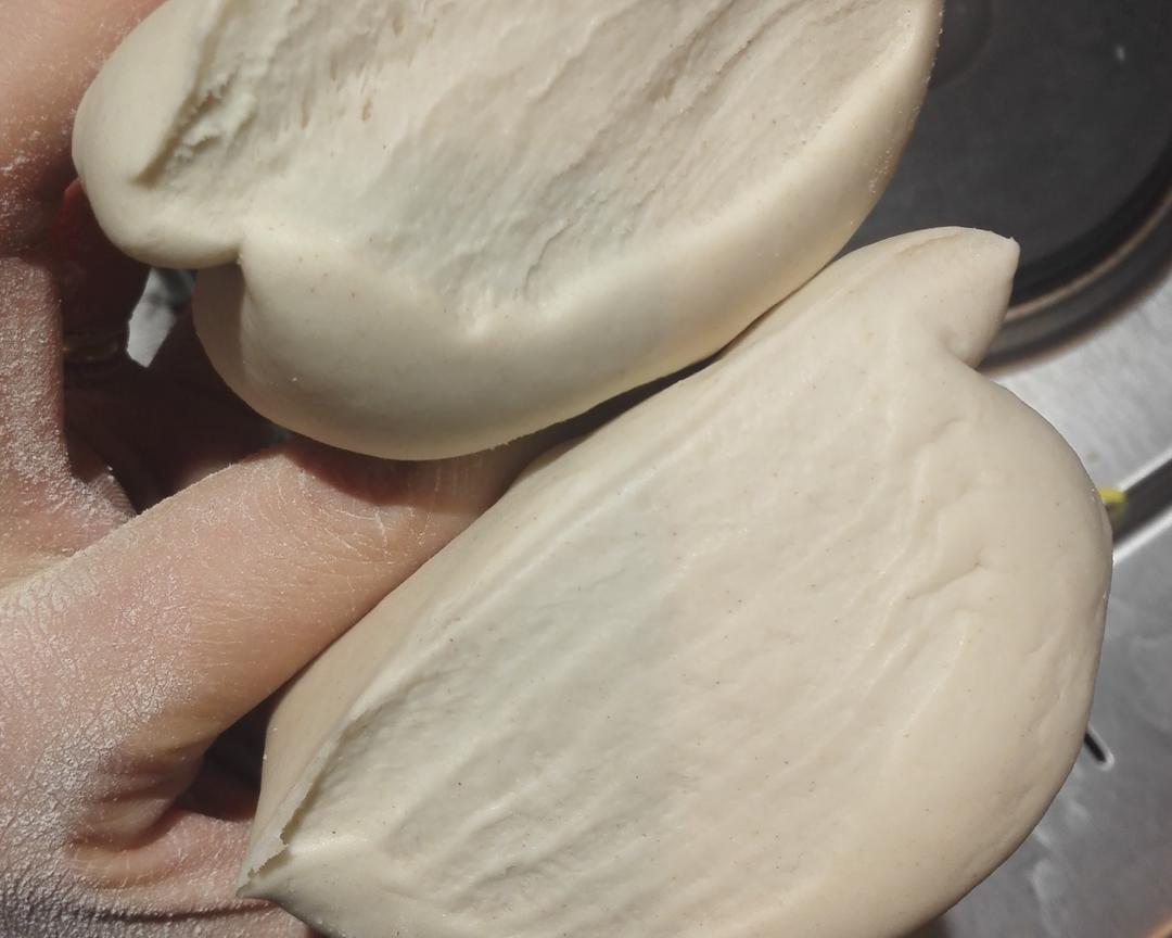 面团拿出用压面机最小档压四到五次。然后开始揉面。(只用压面机压完后随便揉揉就拿去醒发是不行的,我以前就是想走捷径所以压完随便包包就醒发,做出来那个丑啊!) 此图是整个面团揉了400下的切面.