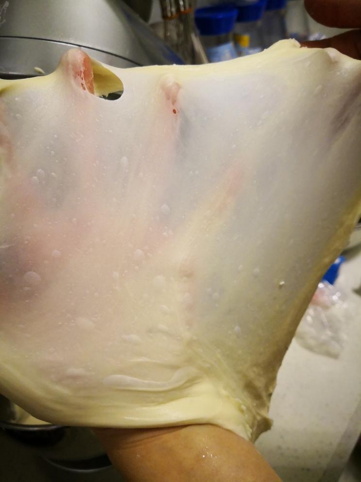 加入软化的黄油并继续揉至扩展阶段能出手膜