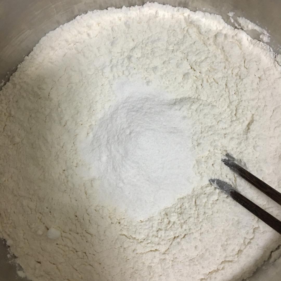 面粉中倒入一袋椰子粉,一大勺白糖
