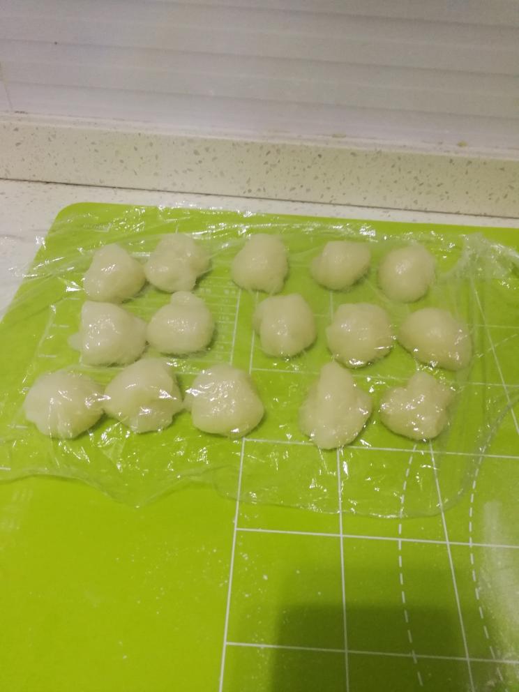 待粉团降至可操作的温度,我把面皮分成15份,并用保鲜膜盖住