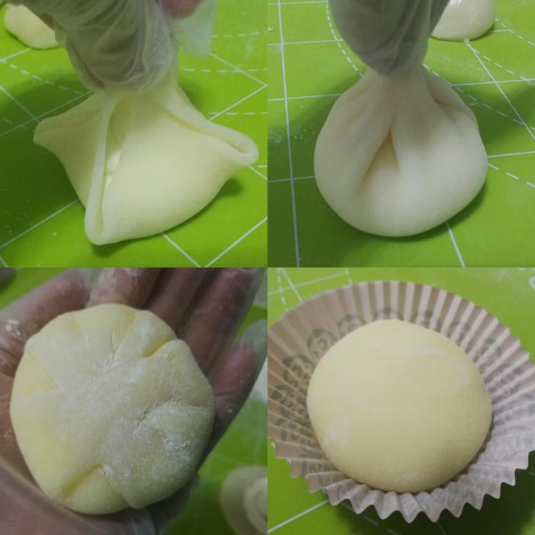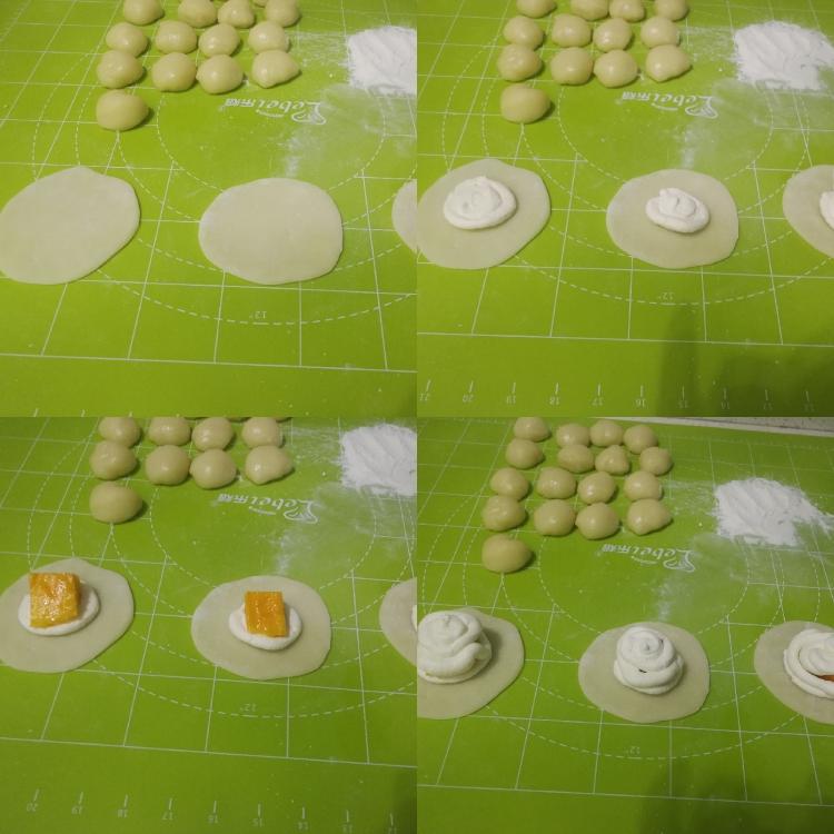 补充一下: 同样的配方,这里以芒果雪梅娘为例,来一组圆形的包法,面团分为25克/个共20个,擀开中间挤上打发的淡奶油,放上芒果,再在芒果上面挤一层奶油