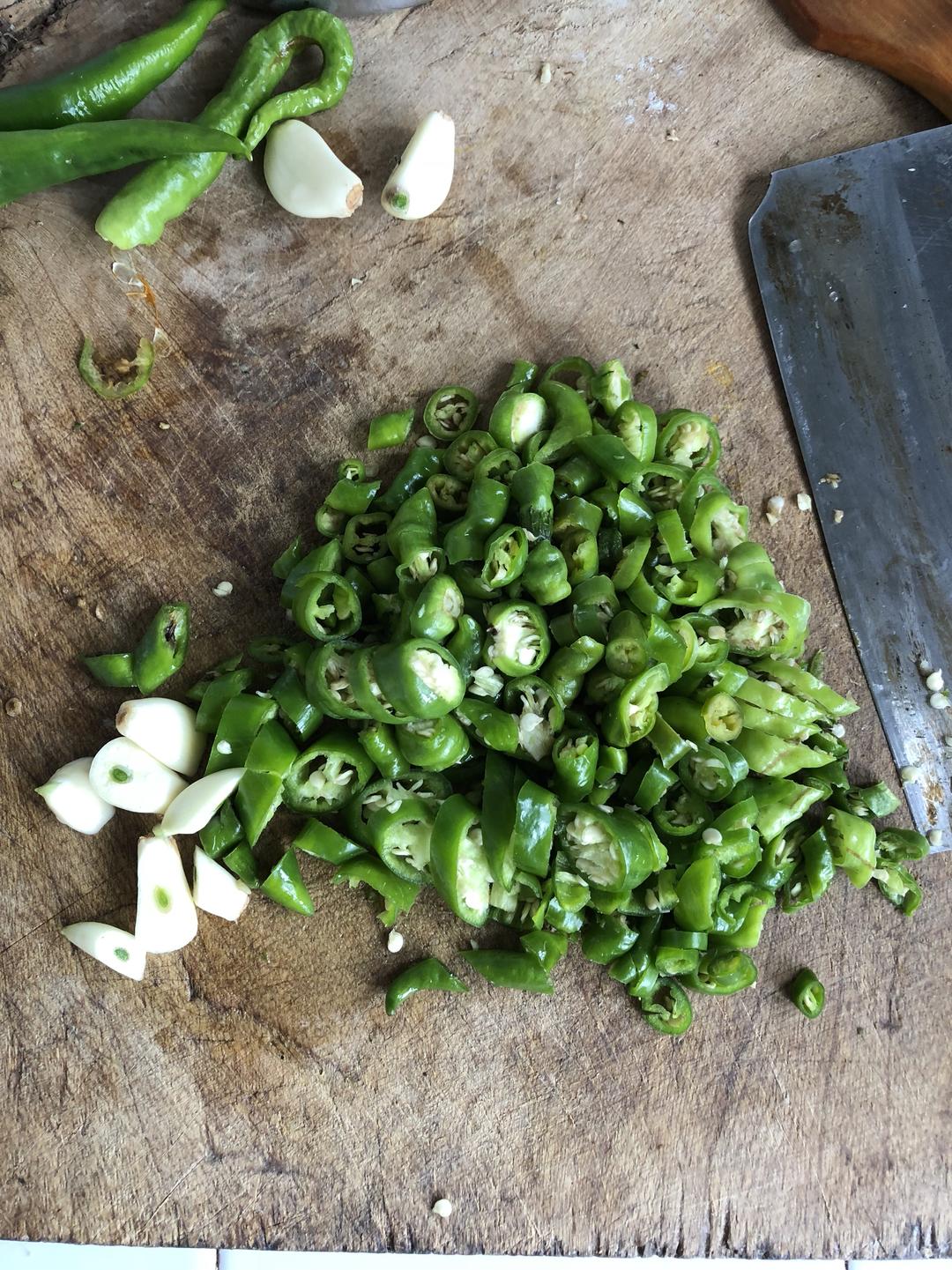 青椒切碎,大蒜切片。少量菜油倒入锅中烧热,倒入切好的青椒蒜片及少量的食盐,炒出辣味倒入煎好切块的浆水菜饼,大火翻炒8分钟出锅。一盘香喷喷的青椒菜饼就做好了。