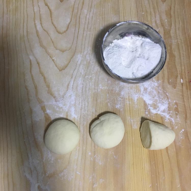 面团发酵好后、分成均匀的小面团,正常可以分成15个,咱们用三个来做样品