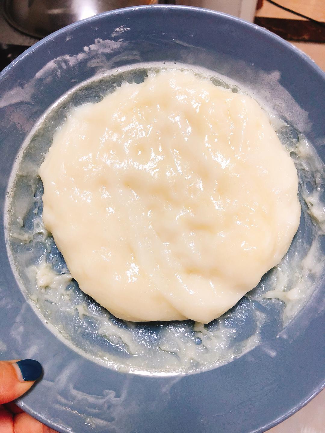 把搅拌好的奶糊放锅里隔水用大火蒸,盖一层保鲜膜,防止水汽进入,大约20分钟左右,筷子插进去没有流质的就差不多了。也不能蒸太久,否则后期面皮会嫌硬。如果第二天包馅的话蒸嫩一些第二天吃皮不会硬,如果当天包馅就蒸略微老一点,自己掌握时间。