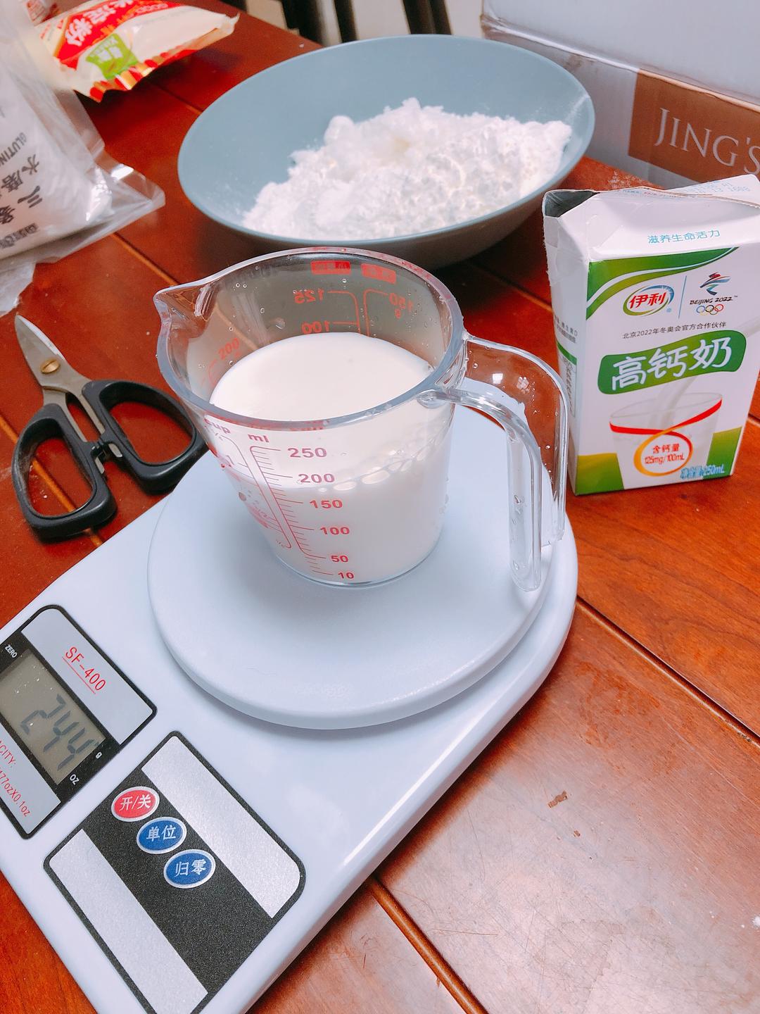 牛奶和糯米粉、玉米淀粉、细砂糖1搅拌均匀,搅拌时如果有小疙瘩就过一下筛
