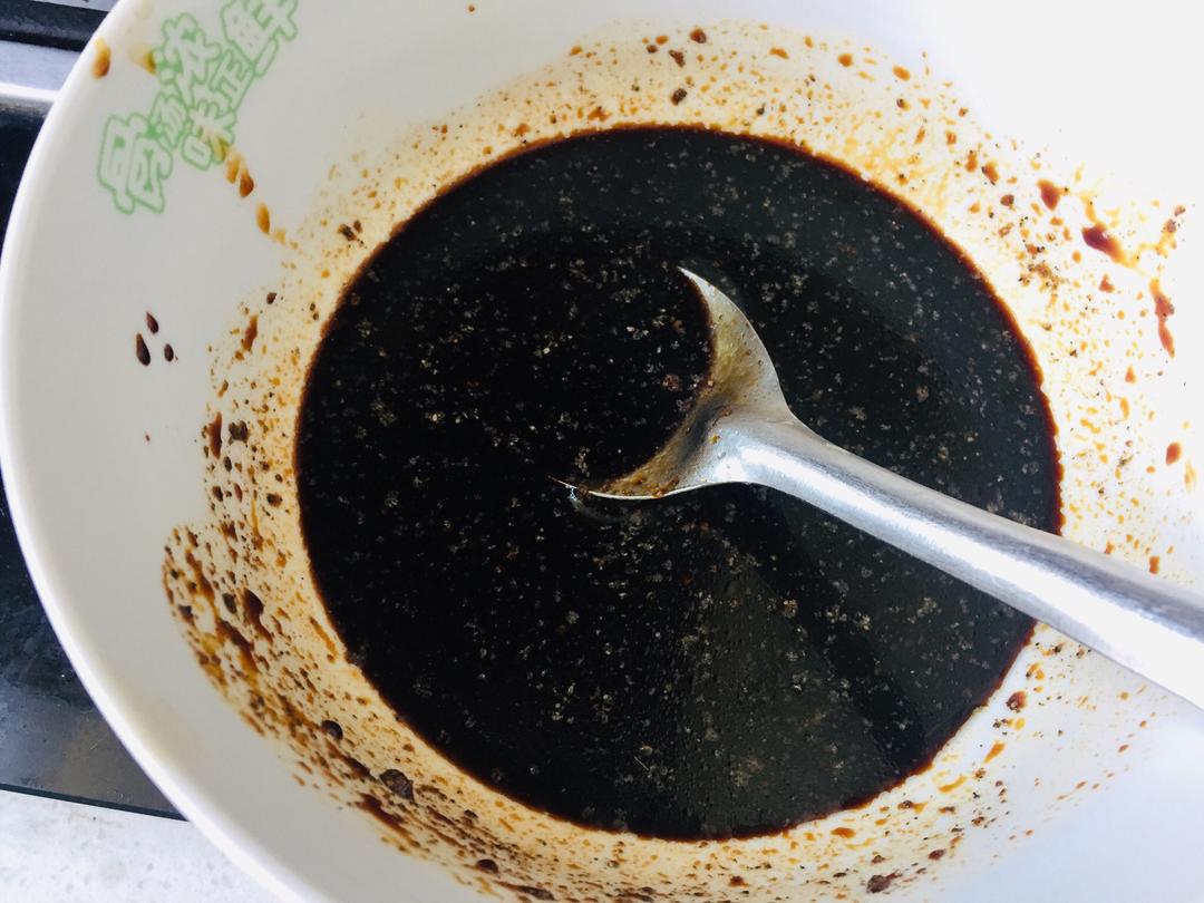 盘中剩下的老抽倒入碗中大约两勺,再加两勺生抽,一勺糖,两勺煮肉的水,少许胡椒粉,调成碗汁备用;