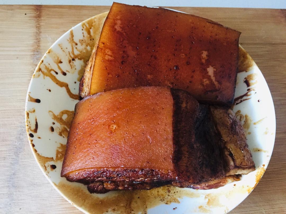 捞出五花肉,用牙签把肉皮扎一扎,会看见有油脂流出,然后趁热在四周抹上老抽上色,都抹匀后肉皮朝下在放有老抽的盘里泡10分钟,然后拿出五花肉,肉皮朝上晾干;