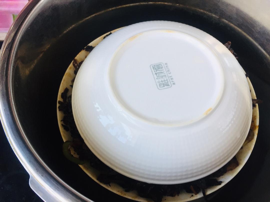 蒸肉盘放入高压锅,水开呲汽后小火再蒸40-50分钟(如果不用高压锅用普通蒸锅需要正一个半小时左右);