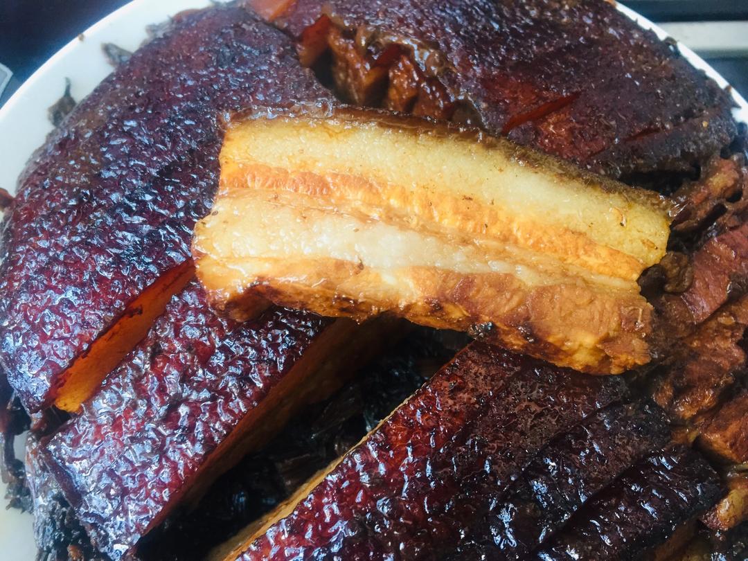 用夹子把蒸肉盘取出,倒出汤汁,然后在蒸肉盘上面扣一个干净的大盘,迅速翻转倒扣,把汤汁再均匀淋到扣肉上,上桌咯!