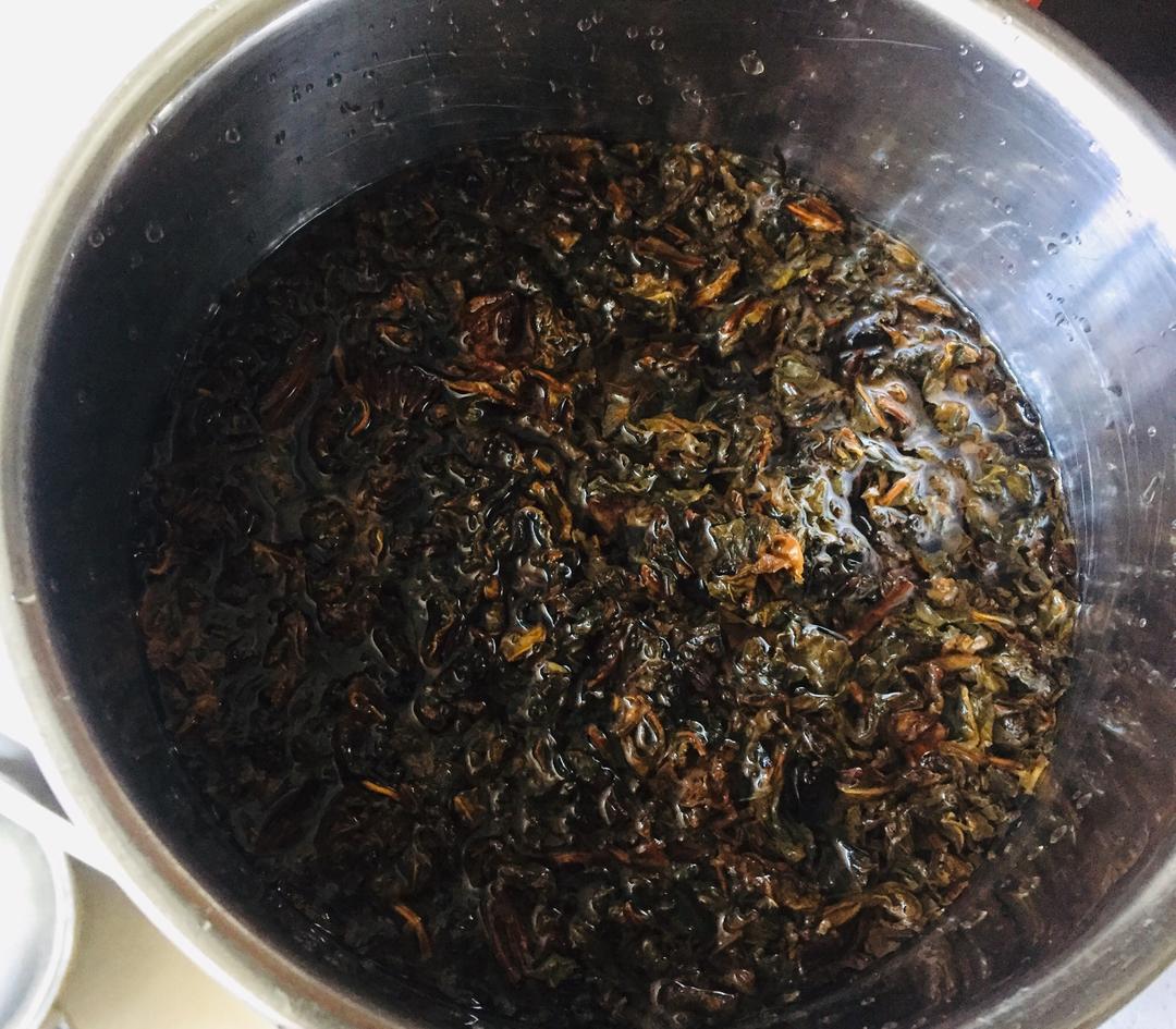 然后上面和周围盖上炒好的梅干菜,压紧;