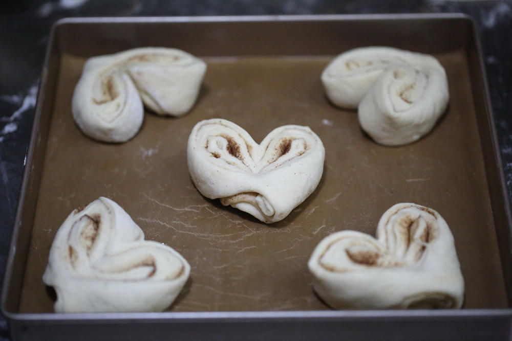 用双手把切口面翻上来,整理一下成心形;