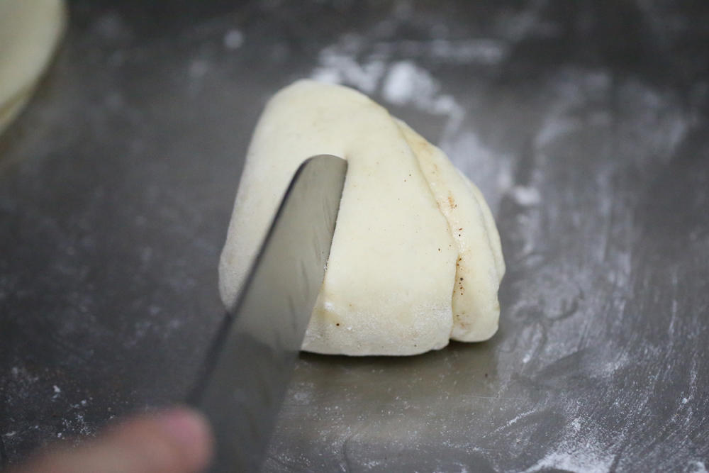 把半圆再拦腰对折,然后用刀在对折线上竖方向切一刀,保留上边沿不切断;