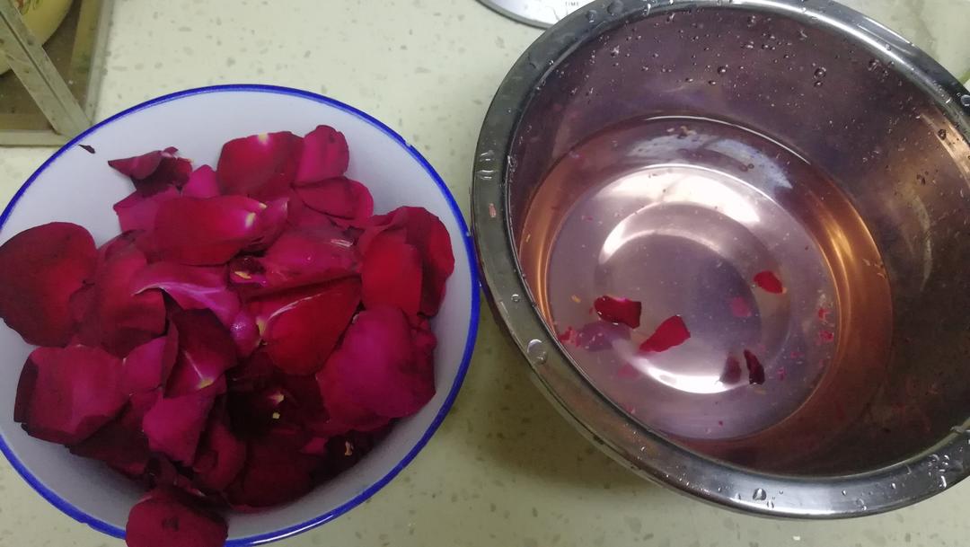 买的新鲜云南可食用墨红玫瑰,打开包装盒时整个厨房里弥漫着醉人的花香。把外面有伤痕的摘掉(不要丢弃,后面有用),我没有用水洗玫瑰,用一个大碗装了一瓶醋,把玫瑰花瓣在醋里淘洗一下就行。