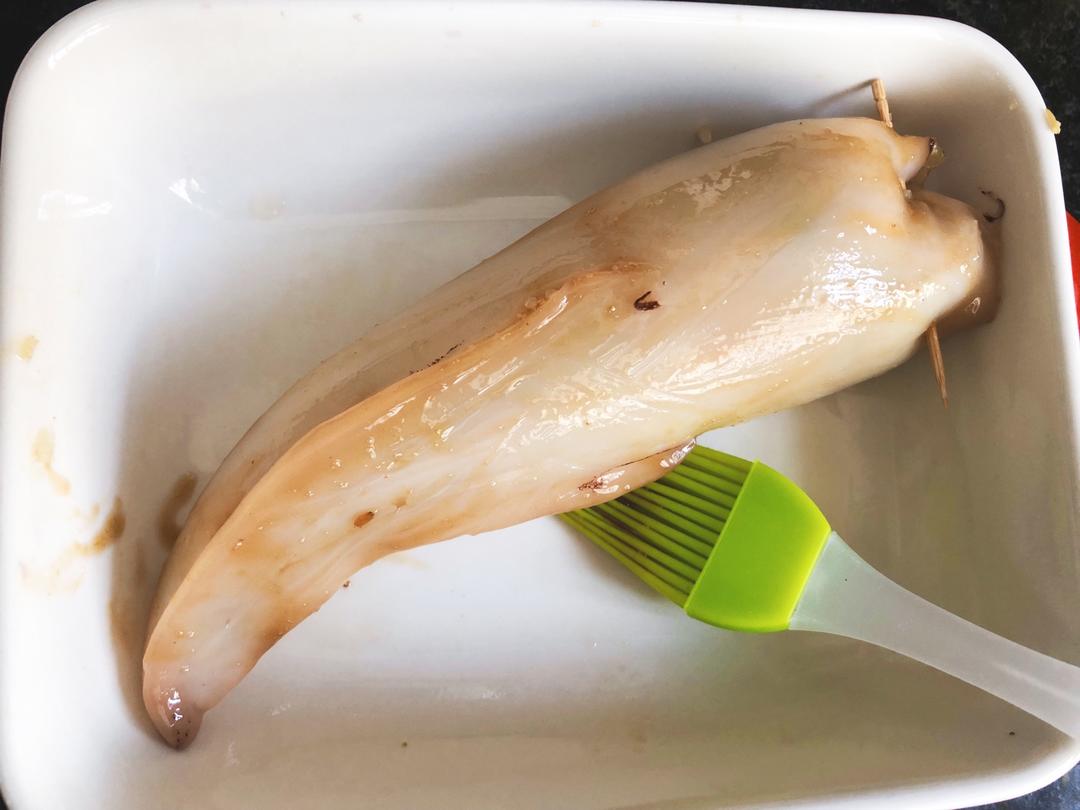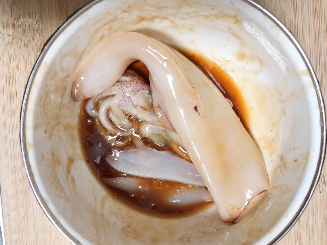 鱿鱼去掉内脏和外面的一层黑膜,洗干净,用照烧酱腌制两小时以上