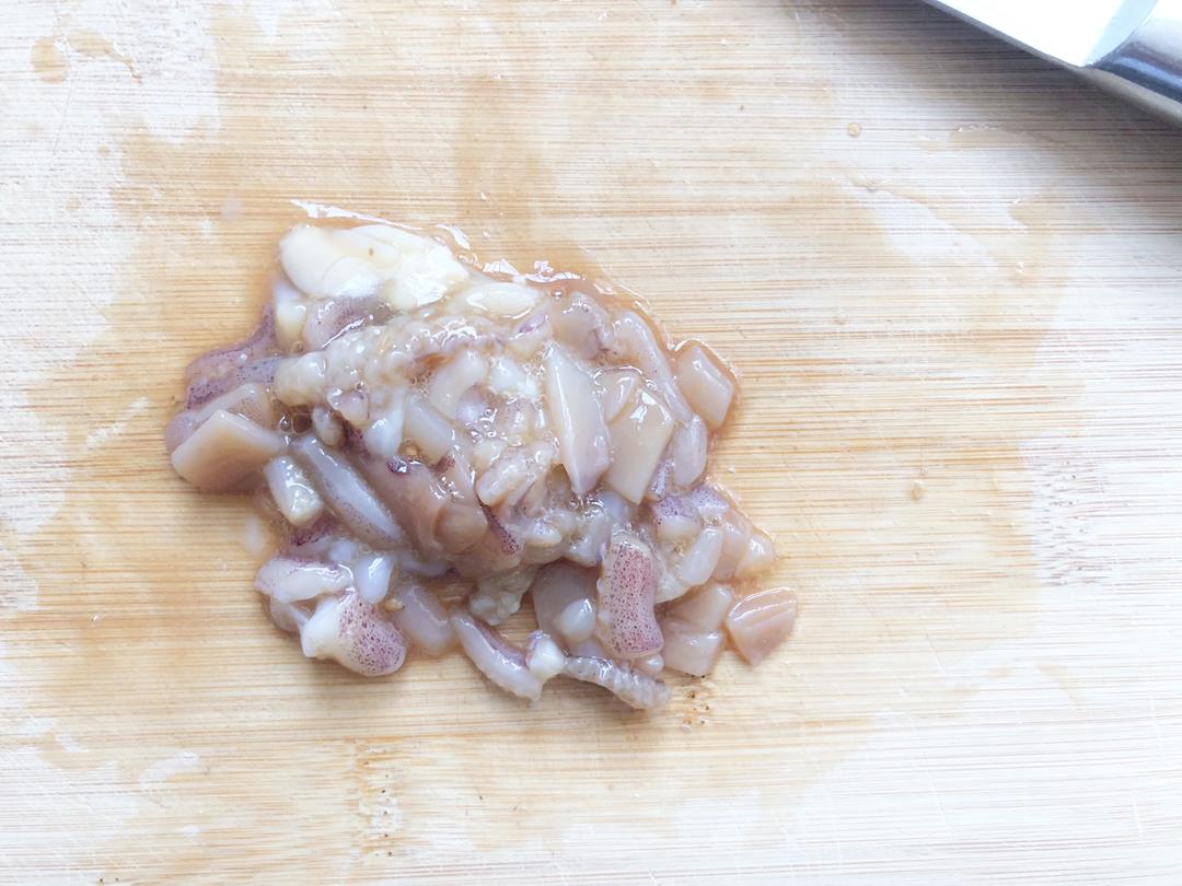 之前腌制的鱿鱼须也切碎碎