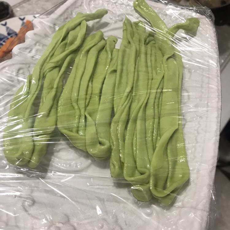 2克盐➕210ml蔬菜汁➕300克面粉,揉成面团、静止醒面10分钟后、再揉一揉、揉到面团有弹性