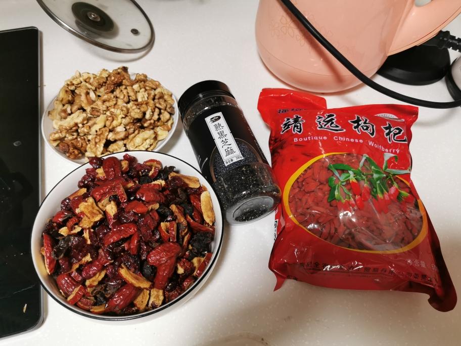 红枣去核,蔓越莓龙眼肉枸杞混合一盆。 核桃烤箱烤香,芝麻也炒一下炒熟。