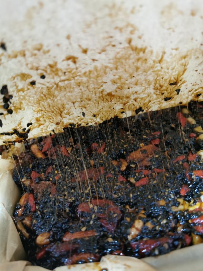 加上步骤二的全部东西搅匀,记得芝麻最后加!很考验臂力,我搅拌到木勺折断了,哈哈。均匀之后倒入模具,记得垫油纸好脱模。放冰箱冷藏固定。