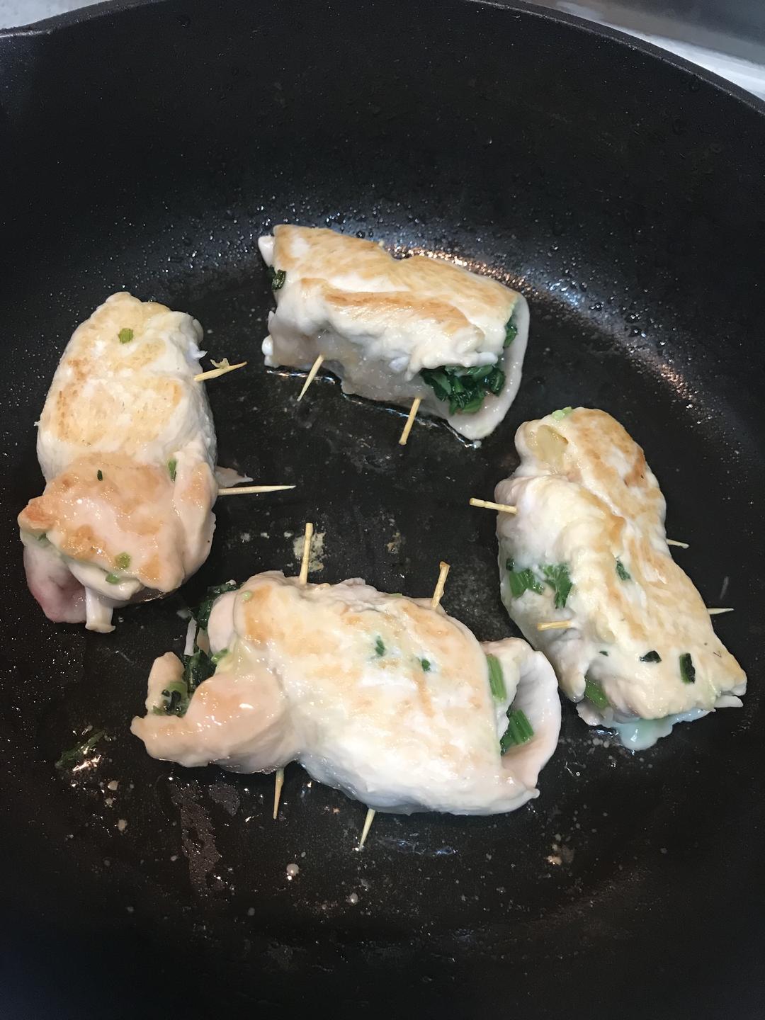 鸡胸肉上撒一点盐和黑胡椒,铺一层菠菜,再铺一层芝士,卷起来,用牙签稳固住