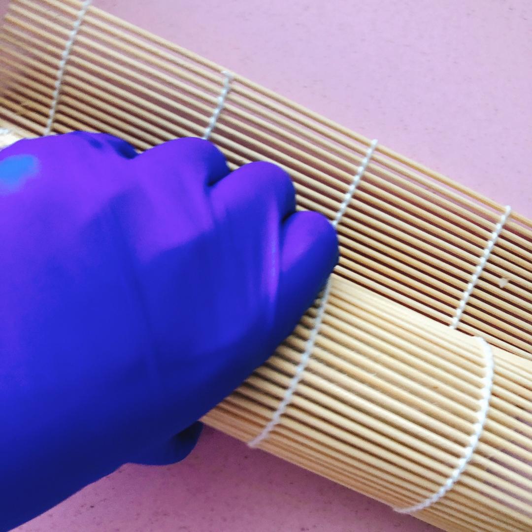 米饭是前一天预约做好的,所以早上起来第一件事情就是把米饭翻拌均匀(松散)~然后把保鲜膜包裹在寿司卷儿帘上。其实也可以不用寿司卷帘,直接用保鲜膜铺米饭做饭包也很简单,我也做过。寿司卷帘就是可以让米饭卷更紧实一些。
