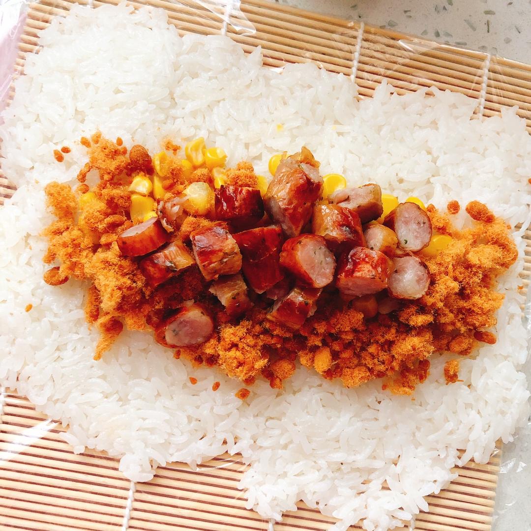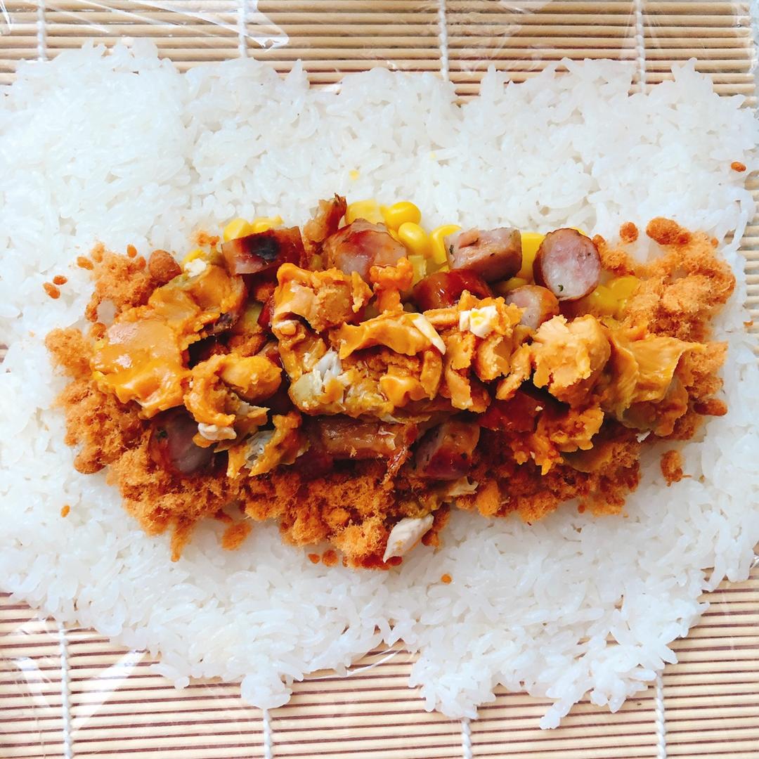 之后,铺压米饭🍚~可以用盛米饭的勺子按压,也可以带食品用手套按压紧实(现在天气凉,米饭拿出来一会儿就没那么热了)~然后铺玉米粒、肉松等一系列你想放在饭卷里面的自己喜欢吃的食材。