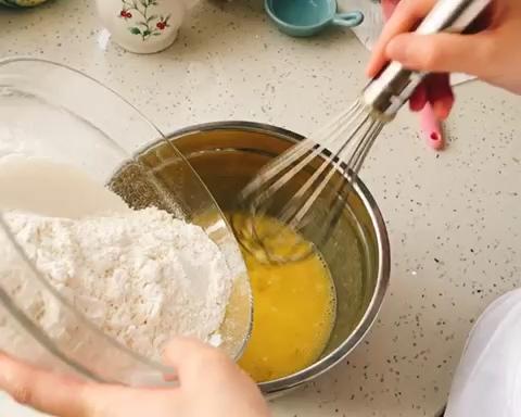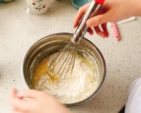 以上材料搅拌均匀后,加入过筛的泡打粉和低筋面粉~可分次加入~加入后轻轻翻拌均匀,不要一直转圈。