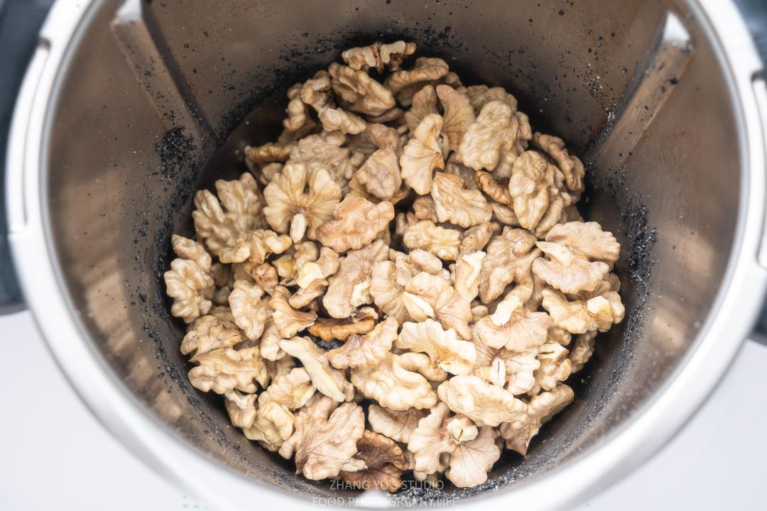 取出芝麻后主锅不需清洗,直接放入300g核桃仁;
