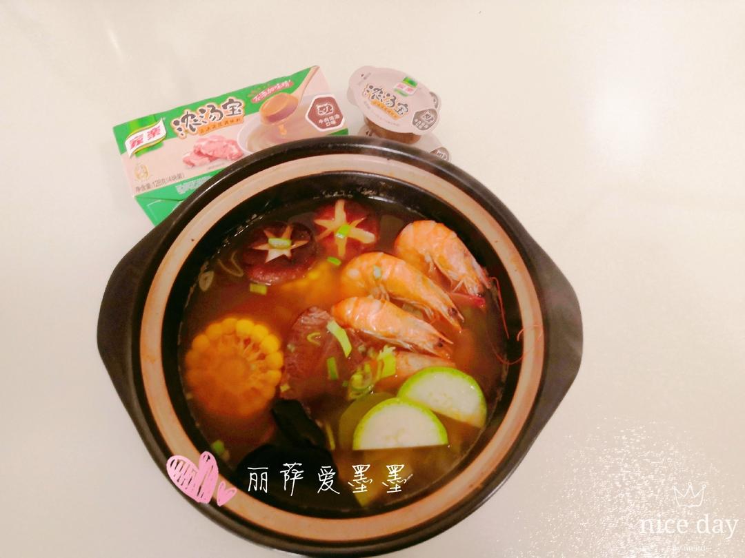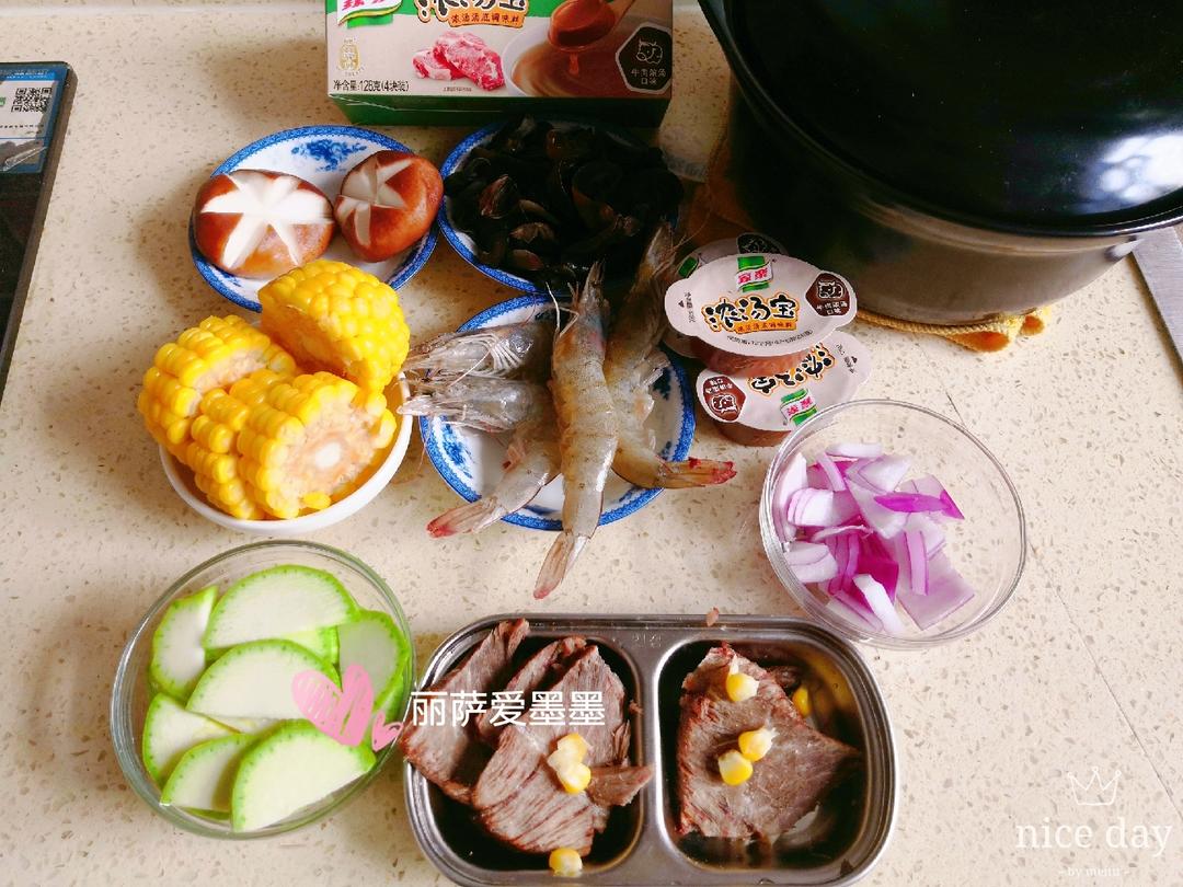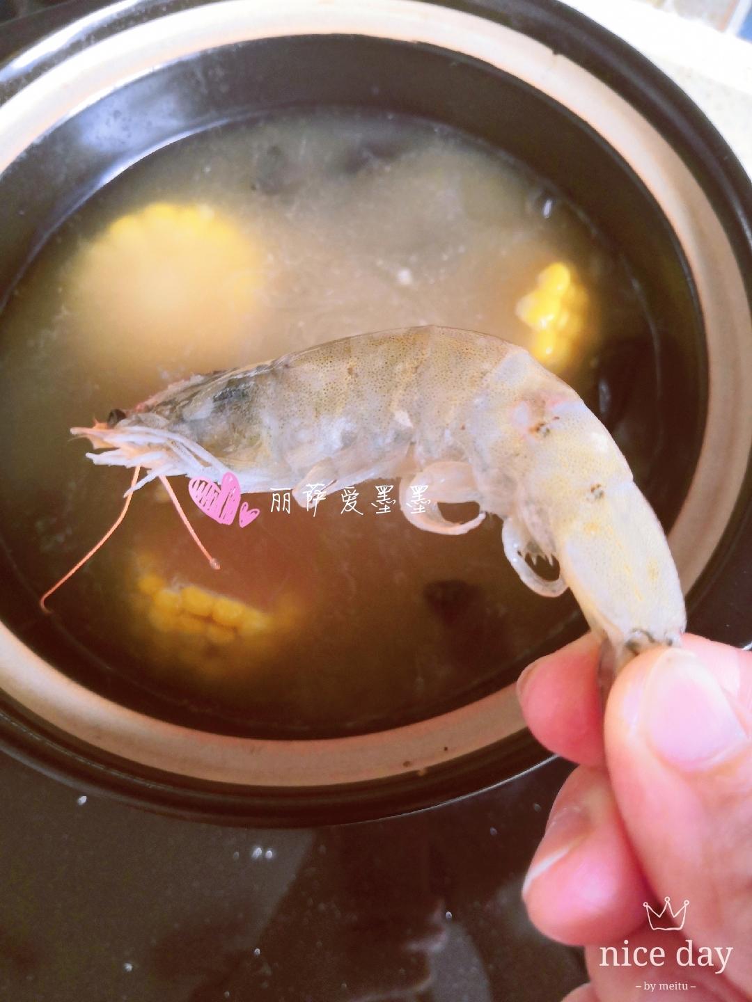 依次加入玉米、鲜虾、(木耳焯下水最好)干净等食材