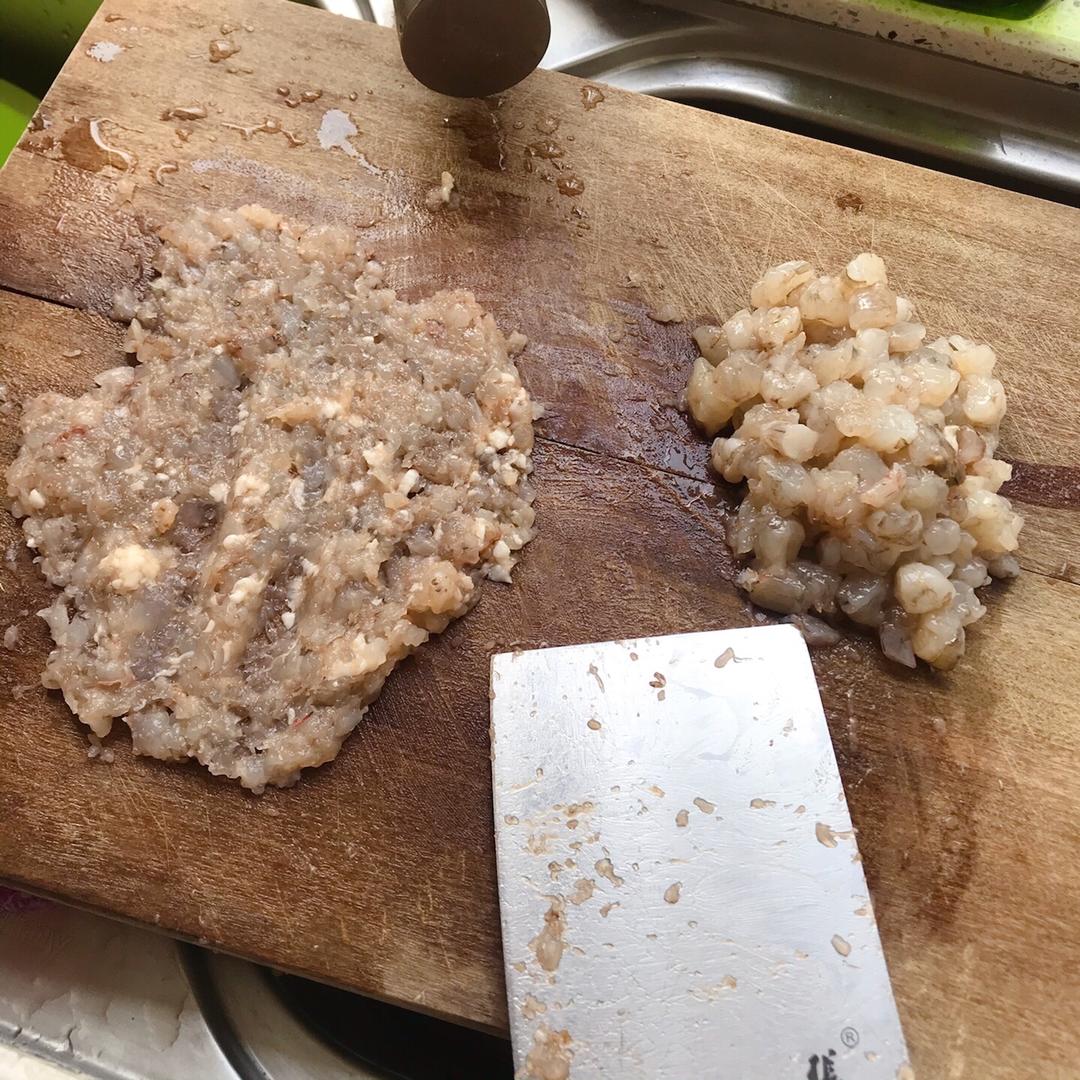 三分之一剁成虾泥,三分之二切成大块的小丁(不切更好,整只包吃起来更过瘾)。