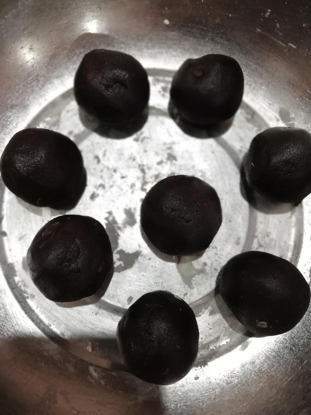 前面揉好的油皮和油酥忘拍照了,从包咸蛋黄这步开始~用称好的每份25克红豆沙包住咸蛋黄。