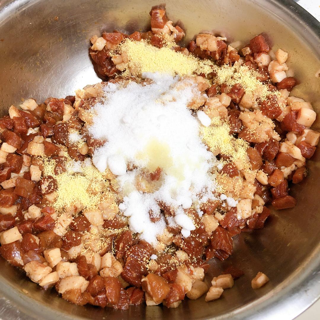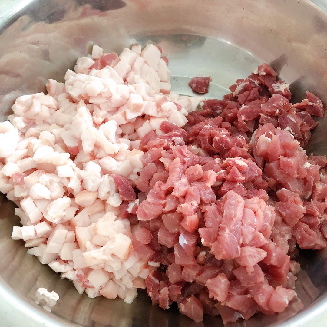 剔除筋膜,切成一厘米的肉丁。不喜欢吃油腻,就少放点肥的,或者把肥肉单独搅碎掺入瘦肉丁里,这样不腻也不柴。我喜欢吃油腻,所以也切了大块😀