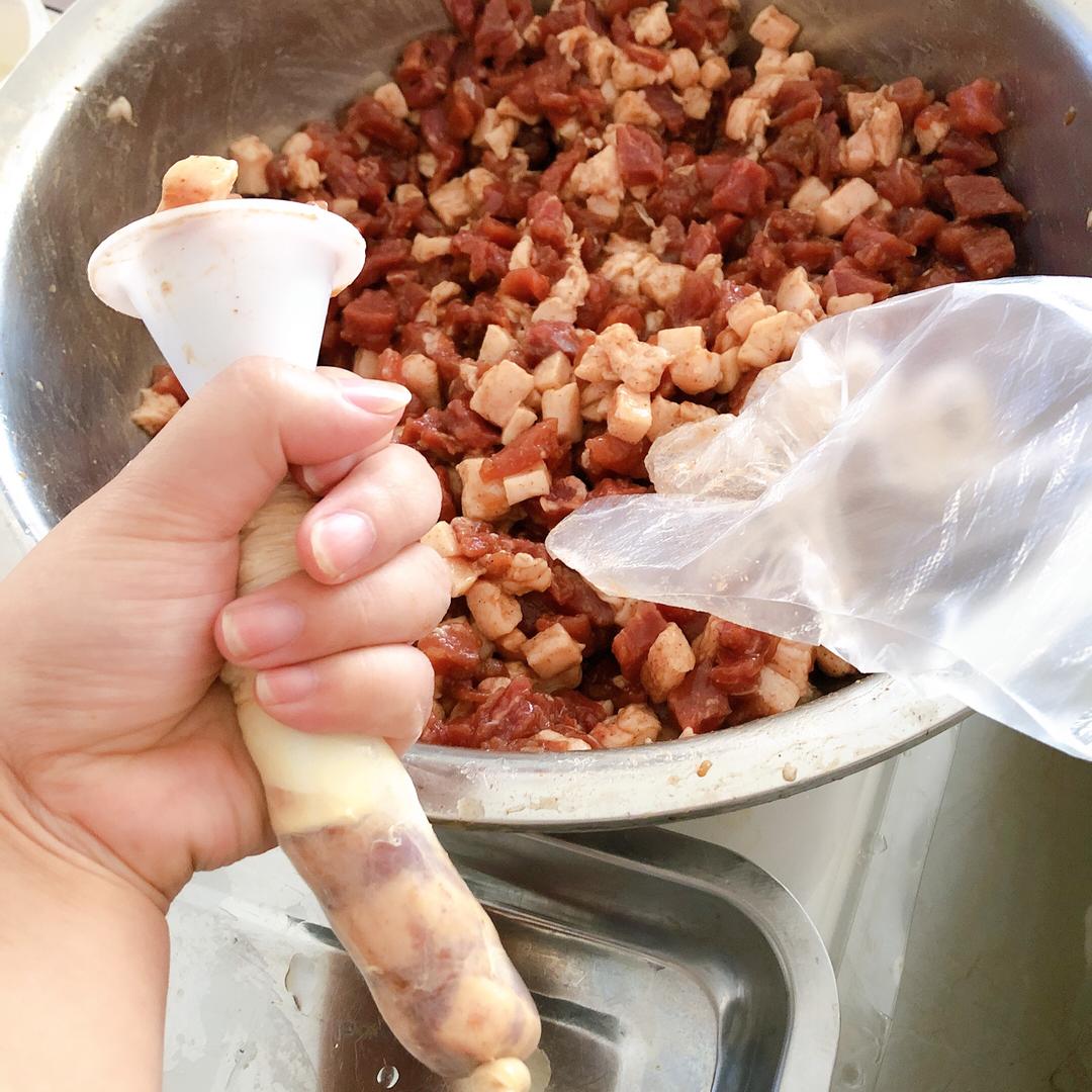 买肠衣送的灌肠器,我只用了漏斗部分,把肠衣轻轻的套在灌肠器上,尾部打结,就可以开始灌肠了
