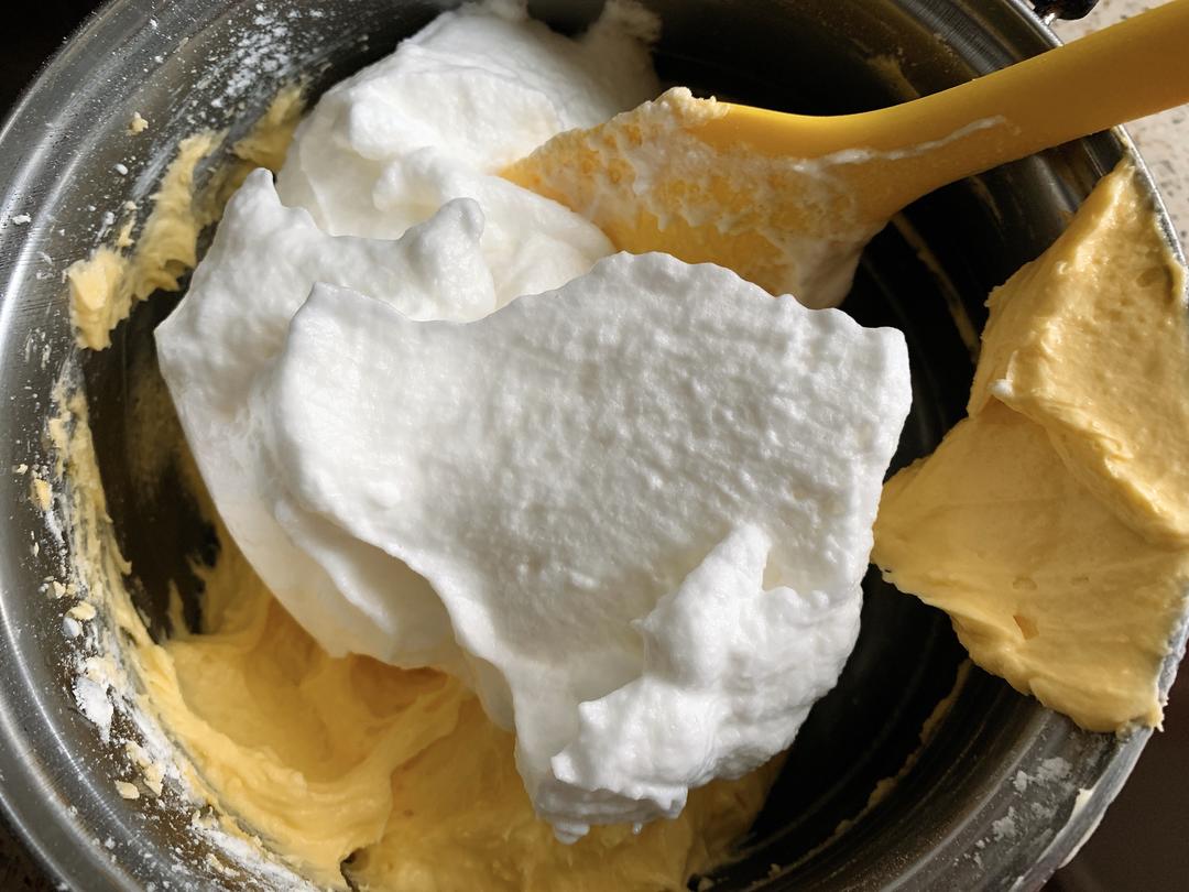 加入两次蛋白和三次低粉后,将面糊倒入剩余的三分之一蛋白中,翻拌均匀