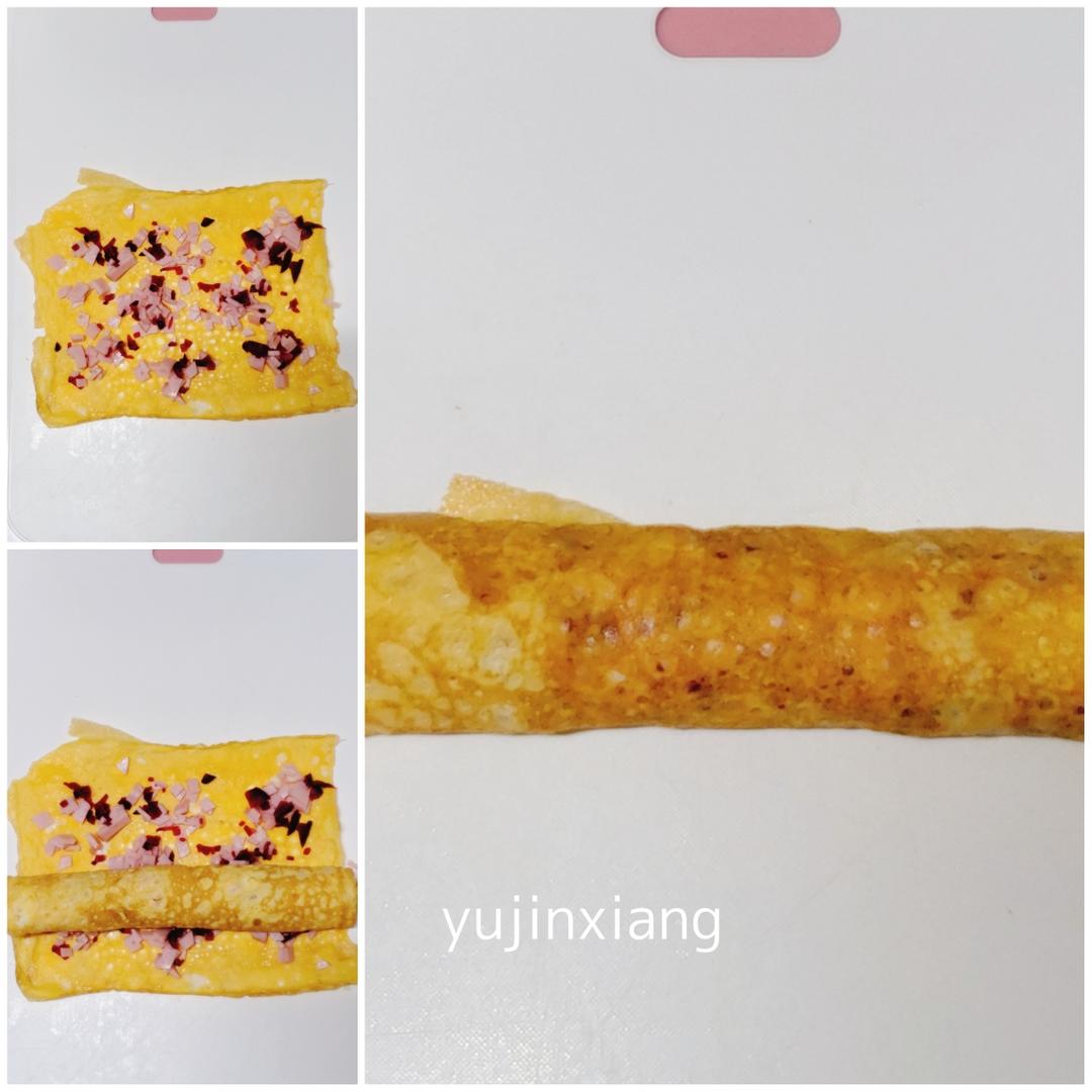 取出鸡蛋皮,放上切碎的火腿肠和红芯萝卜碎,卷成筒状备用。(火腿碎和萝卜碎不要铺平,用来做玫瑰)