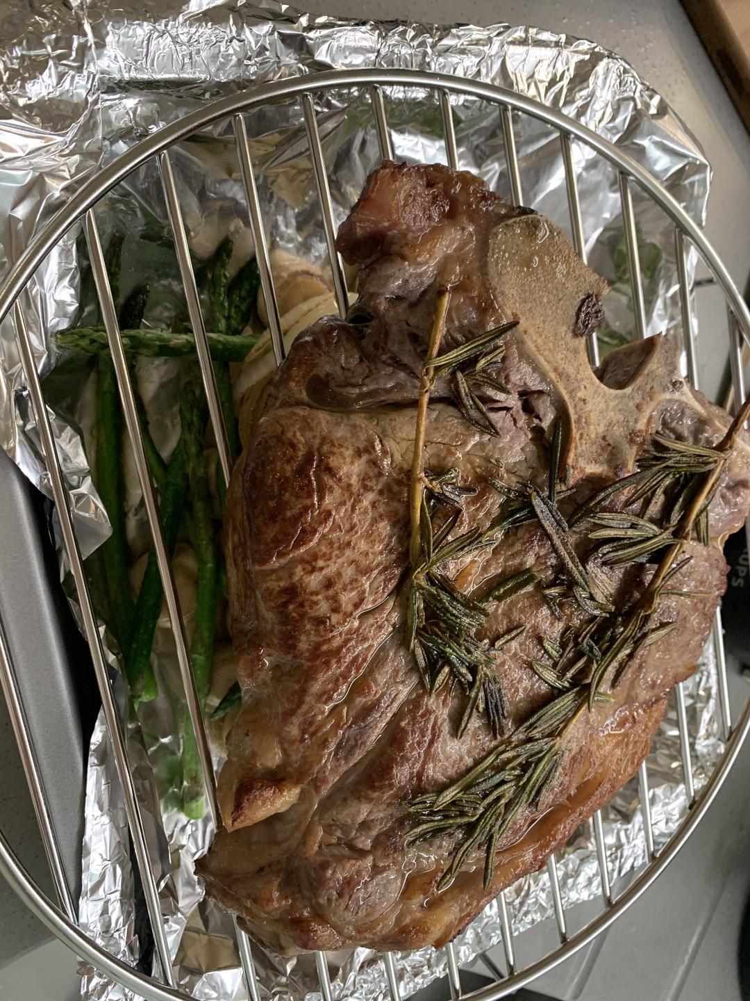 烤箱提前十分钟预热,200度。牛排放入锅中将表面煎至变色(可加入迷迭香一起煎),煎好后放上烤架。之前炒好的蘑菇芦笋加入一些洋葱圈一起放入烤箱。200度烤8分钟。