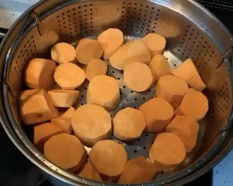 碾压成泥!可以加少许奶油口感会好到爆!没有的可以加牛奶!也可以不加!糖的话自己看着办 ,喜欢甜就多加一点 ,不喜欢就不加,因为这个红薯甜度就够了