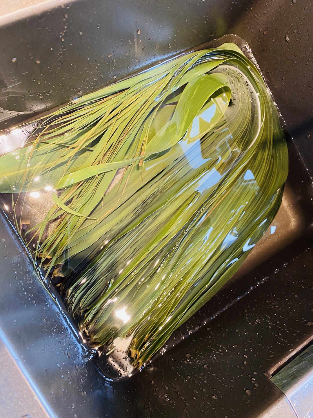 小脚粽的粽叶是比较窄的那种。粽叶提前一晚逐片洗干净。拿一个大盆子用开水烫泡一遍,直到自然变凉后,换一盆干净的水浸泡备用。