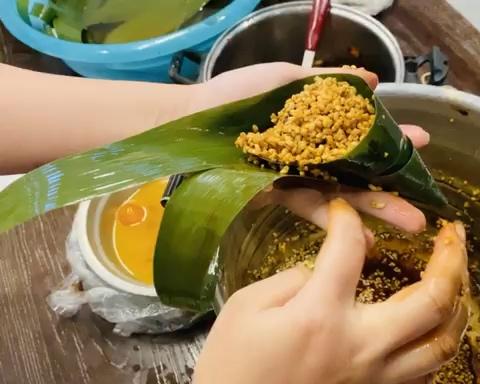 继续把糯米填满整个粽子,满一点没关系,不能太少。
