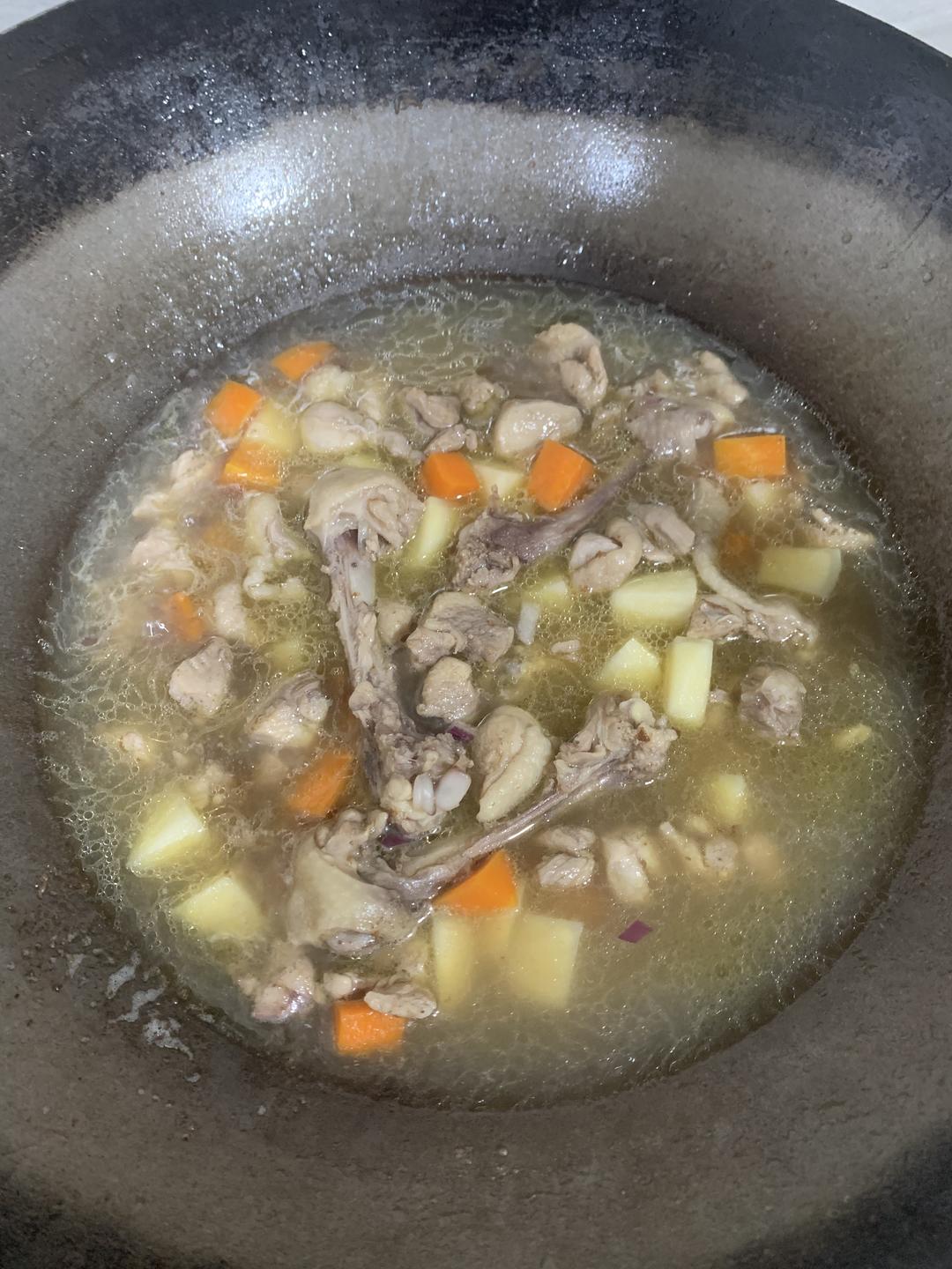 继续中火焖到土豆可以用锅铲轻易穿过(但是也别煮过了,土豆是成块的不是散的),夹去鸡骨。
