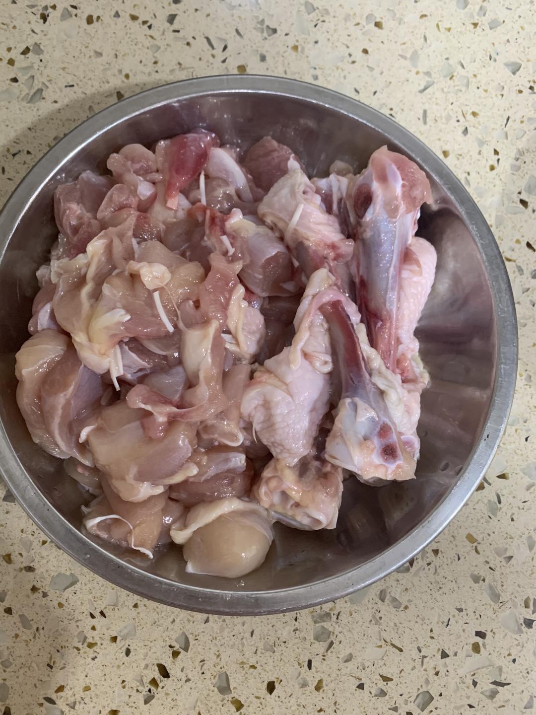 然后把鸡腿肉改刀成小块(我没有刻意去皮,我觉得没皮没骨的肉不够香,所以连着肉的皮保留,掉开的皮弃用)