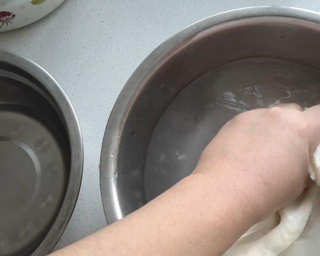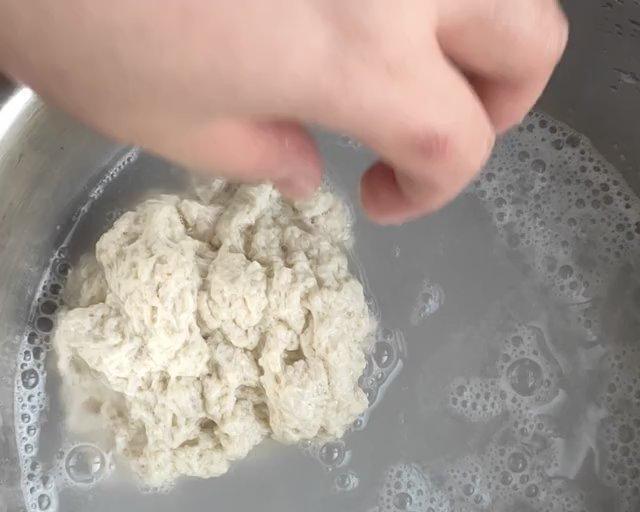 面筋洗好了。很有弹性哦!我总共洗了15遍,才洗到水清。这是个漫长的过程啊!这个水凉的啊,我的手都红了!