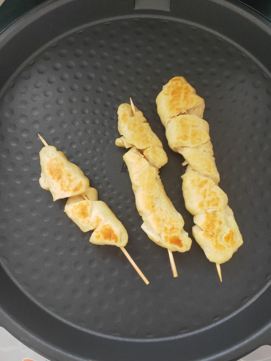 电饼铛预热好后,把面筋放进去烤,我个人觉得烤干一点好吃